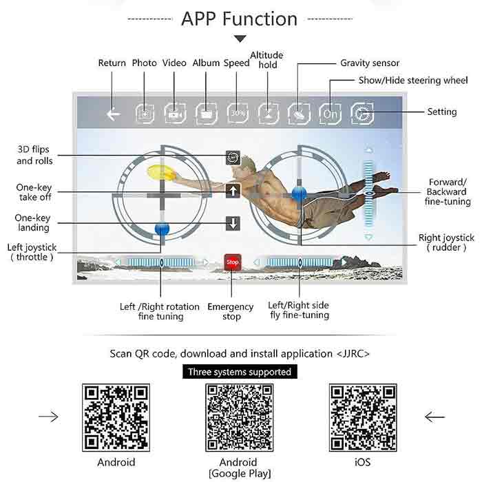 Functions: Sideward flight/Turn left/right,Up/down,Forward/backward/3D rollover/WIFI FPV/Gravity Sense Control/Headless Mode/Altitude Hold